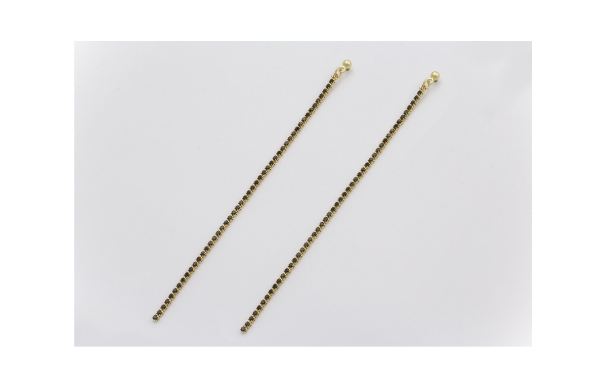 Pendientes perno bolita dorada mate con fleco cadena de strass mini negro. Largo 10cm.
