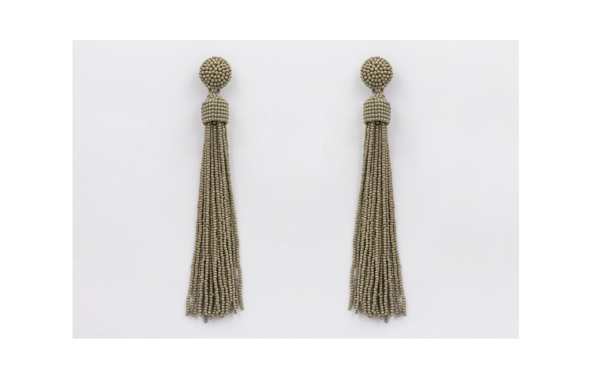 Pendientes perno media bola y fleco abalorio color visón. Largo 14cm.
