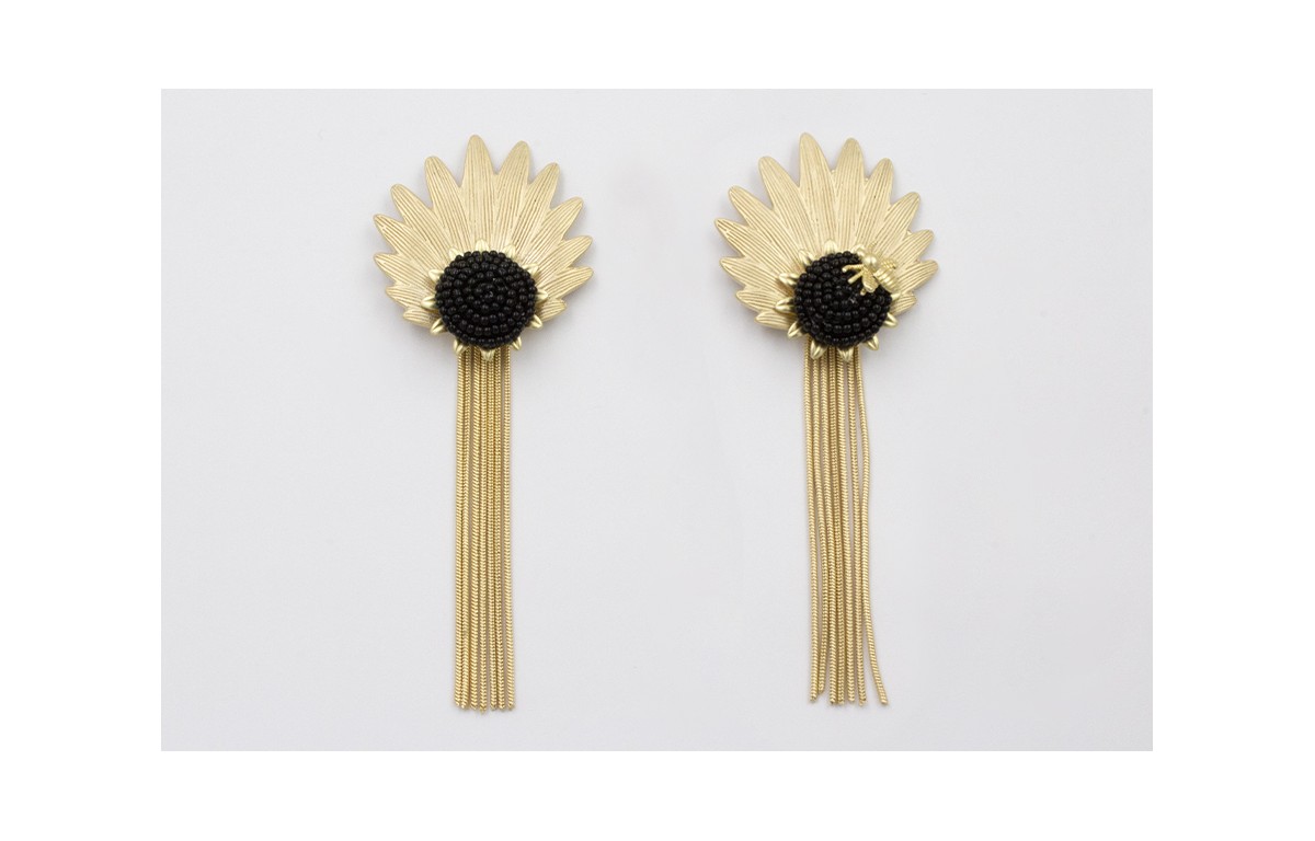 Pendientes perno hoja concava dorada mate con flor negra abalorio, abeja y fleco dorado mate. Largo 10cm.