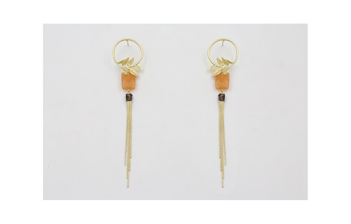 Pendientes perno aro con rama dorado mate, fleco cadena nudo falso microdriza negra y piedra facetada melocotón. Largo 11,5cm.
