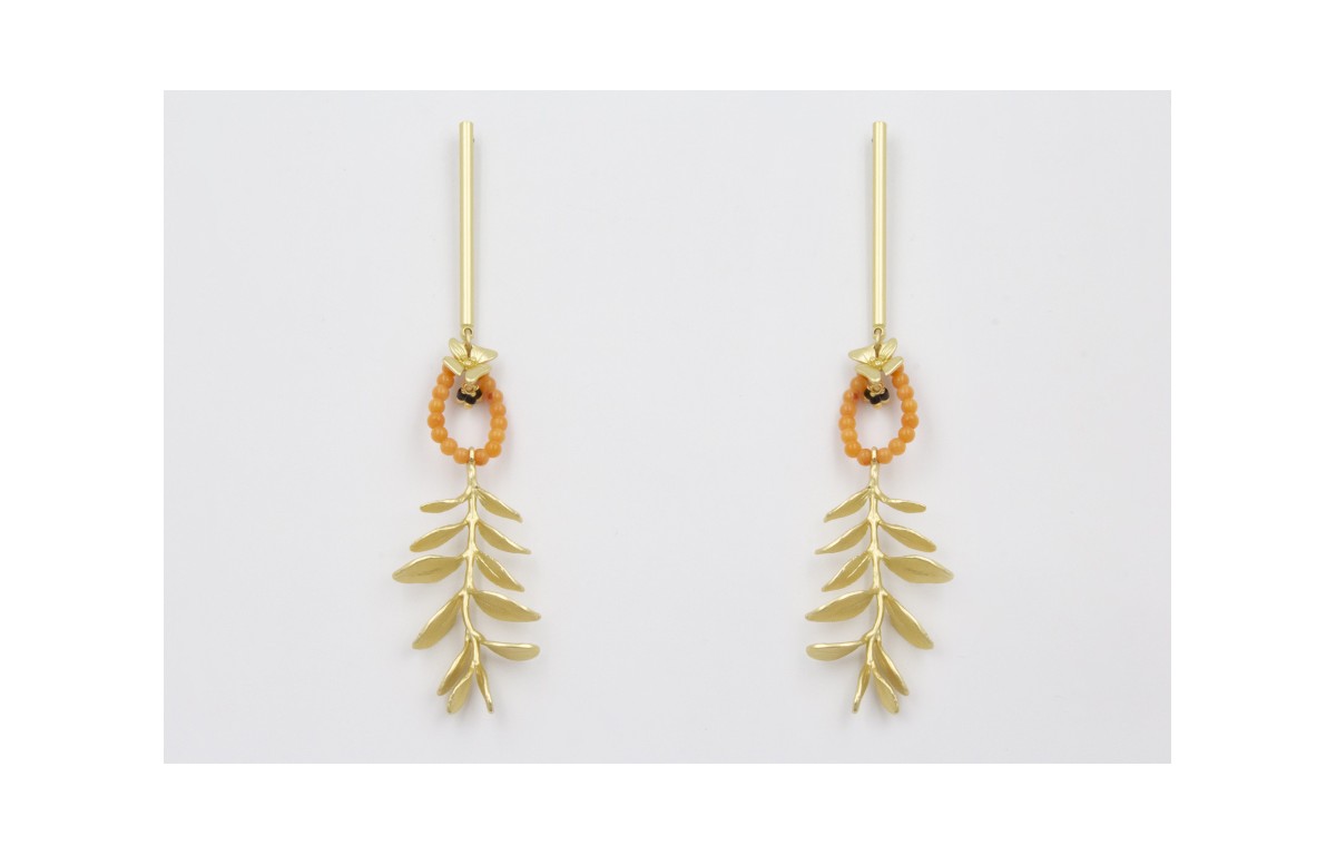 Pendientes perno listón dorado mate con aro corales, flor y rama con hojas. Largo 9cm.