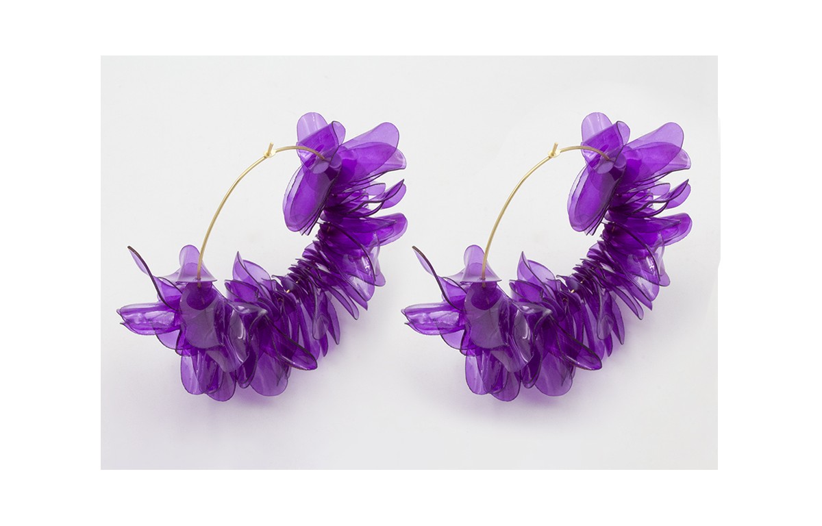 Pendientes aro grande dorado mate con lentejuelas ovaladas moradas. Largo 6,5cm.