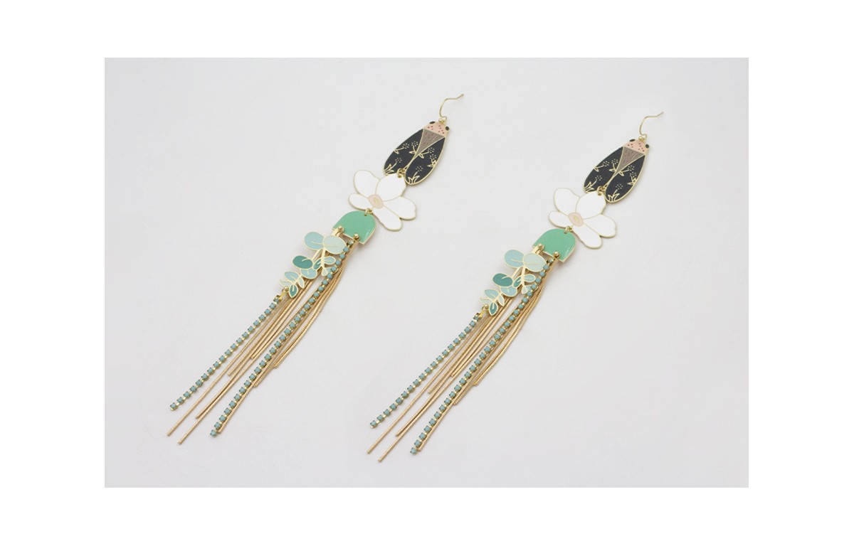 Pendientes gancho sencillo con polillas plana verde y rosa, flor blanca y mostaza,rama turquesa, semicirculo turquesa, fleco cadena de strass turquesa y cadena cordón. Largo 18cm.