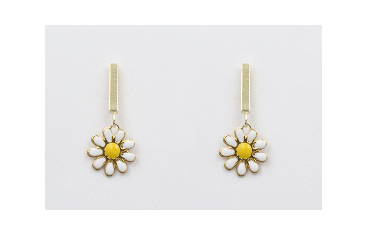 Pendientes acero inoxidable con perno listón y colgante margarita blanca y amarilla. Largo 2cm
