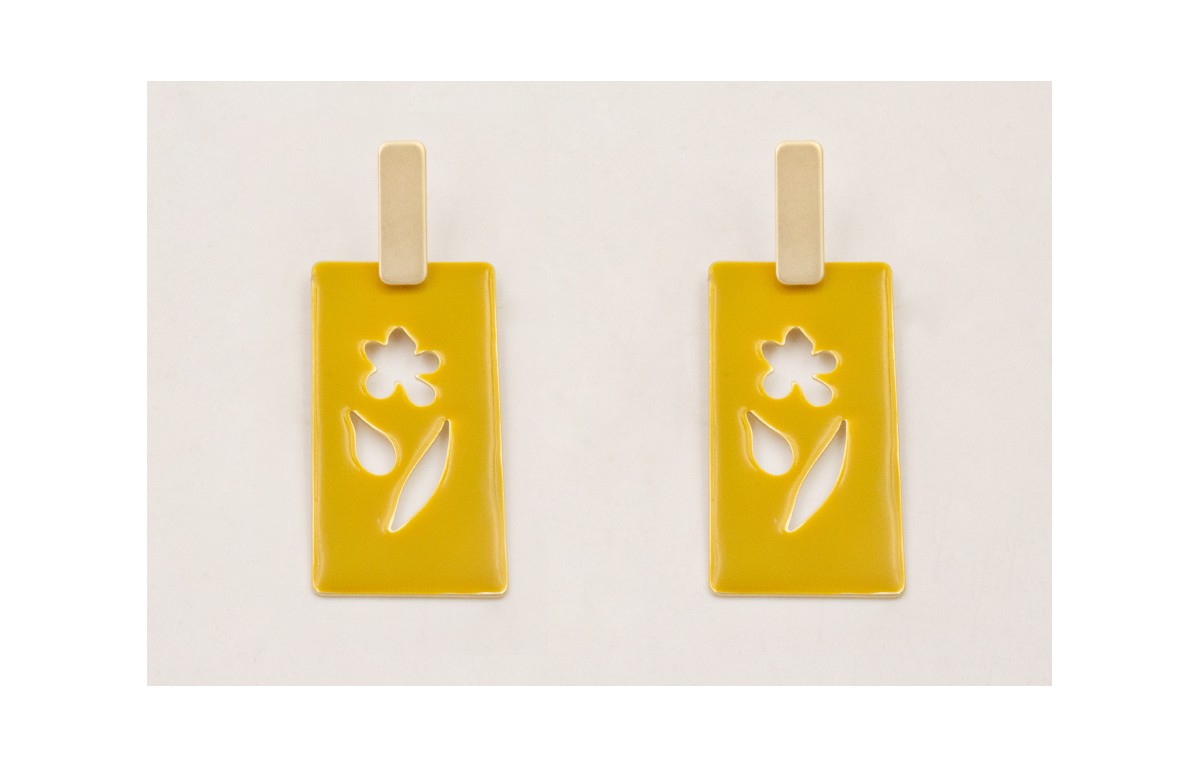 Pendientes perno listón dorado mate con colgante rectangulo esmalte pistacho y flor calada.