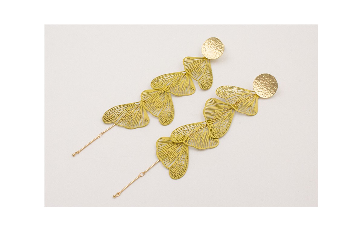Pendientes perno disco dorado mate con cadena listones y colgando alas de mariposa esmalte mostaza rematados en bolita.