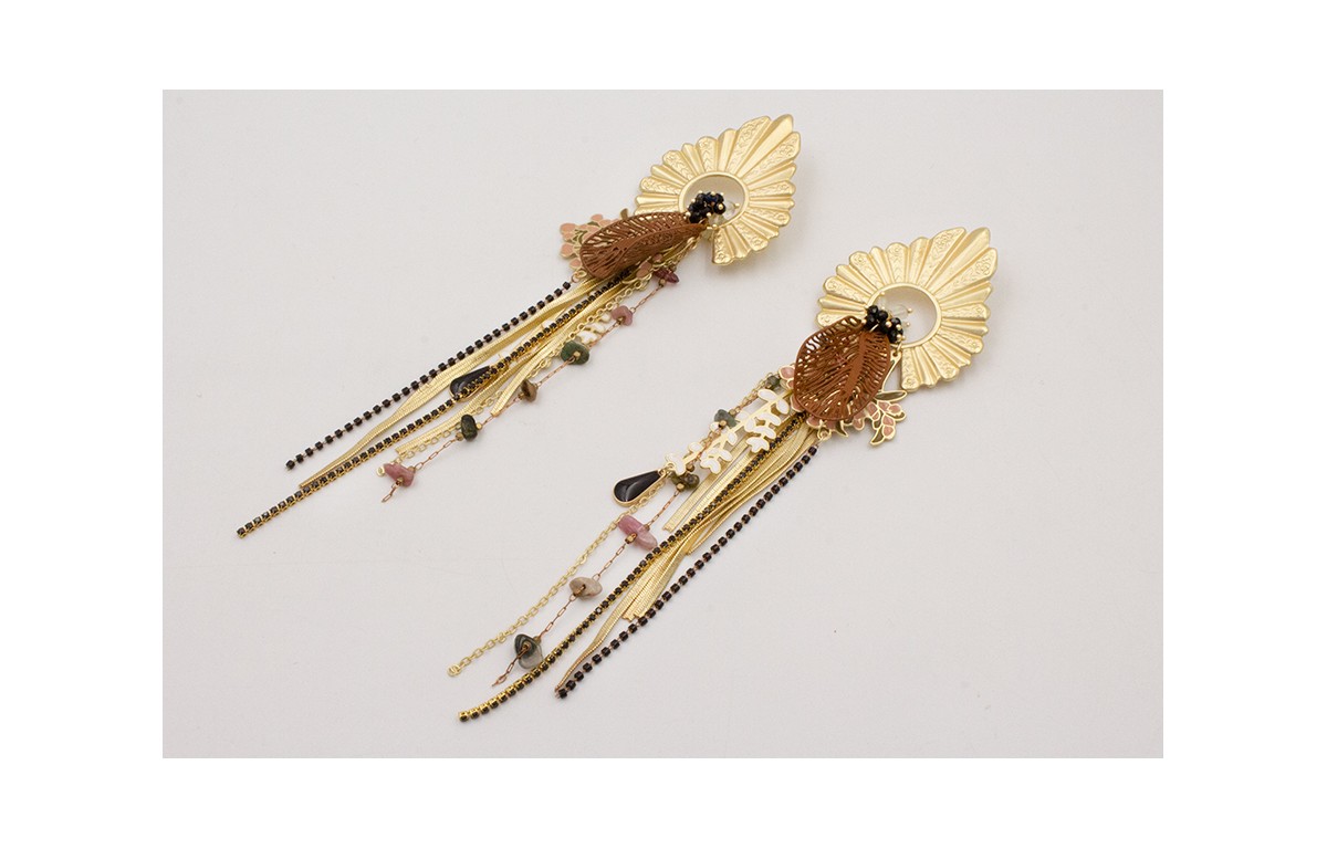 Pendientes perno hoja estriada dorada mate con burruño bolas negras y verdes, ramas y pajaros esmaltados, flecos varias cadenas.