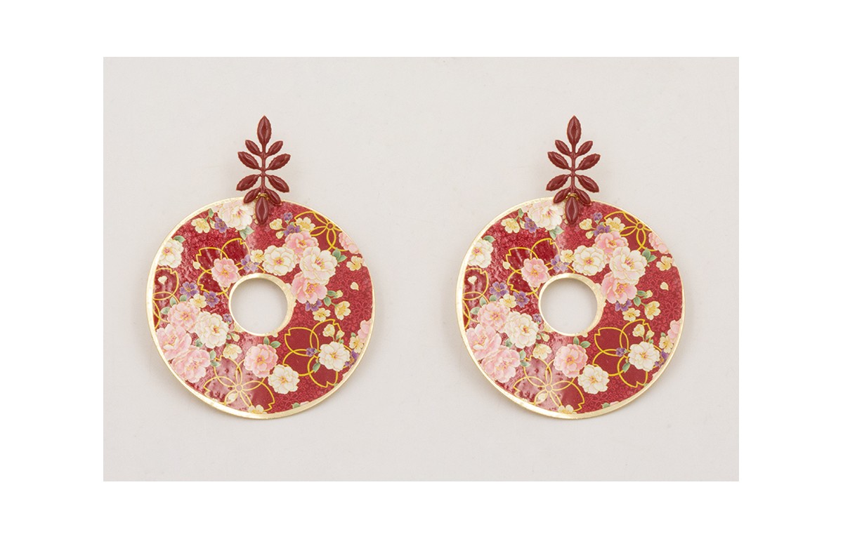 Pendientes perno pétalos esmaltados granate con discos estampado rojo y rosa.