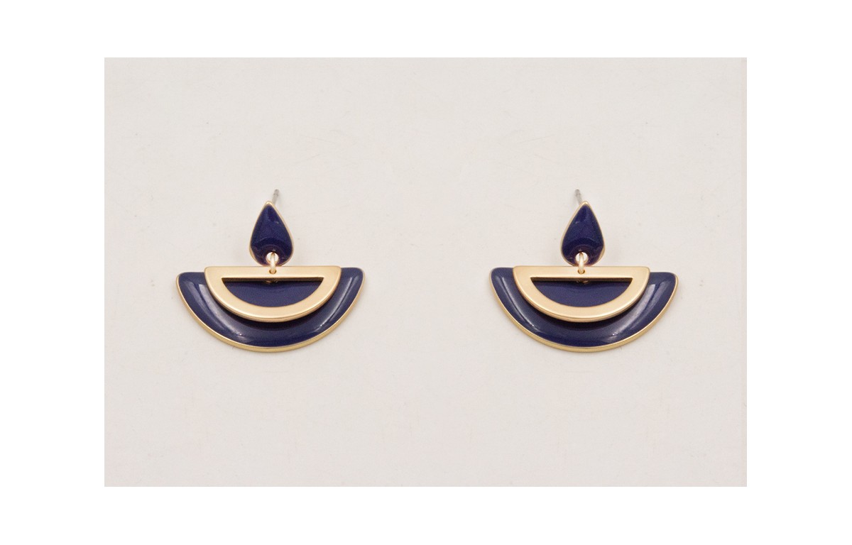 Pendientes gota mini esmaltada azul marino con semicirculo hueco dorado mate y semicirculo esmaltado azul marino.