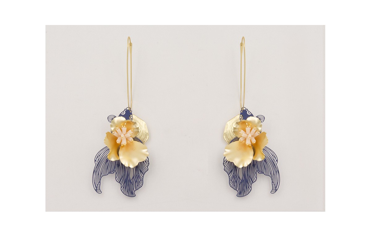 Pendiente eslabon grande,concha dorada,pez tropical azul oscuro,flor 3 petalos dorada,burruño rectangulos beige