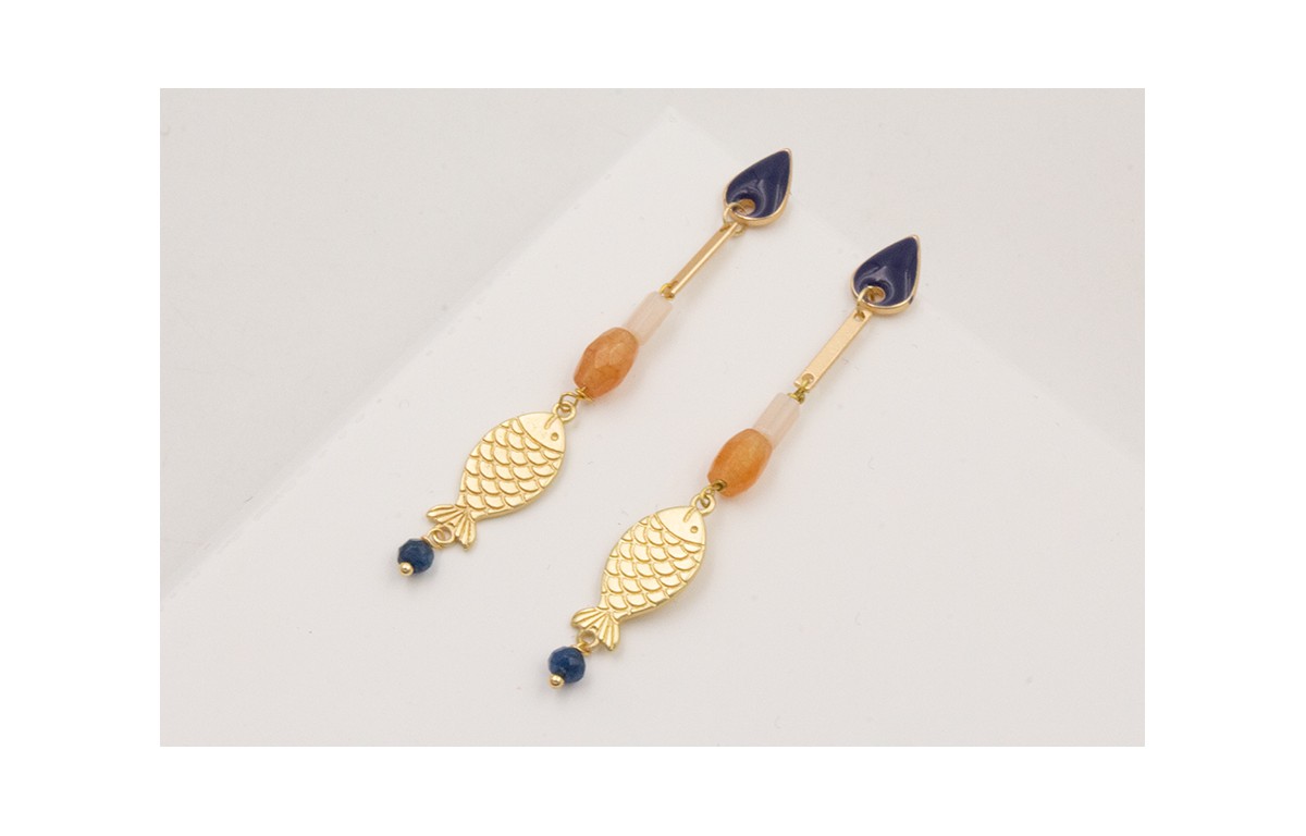 Pendientes perno gota esmaltada azul oscuro,semipreciosa,rectangulo beige,pez dorado,facetada azul oscuro