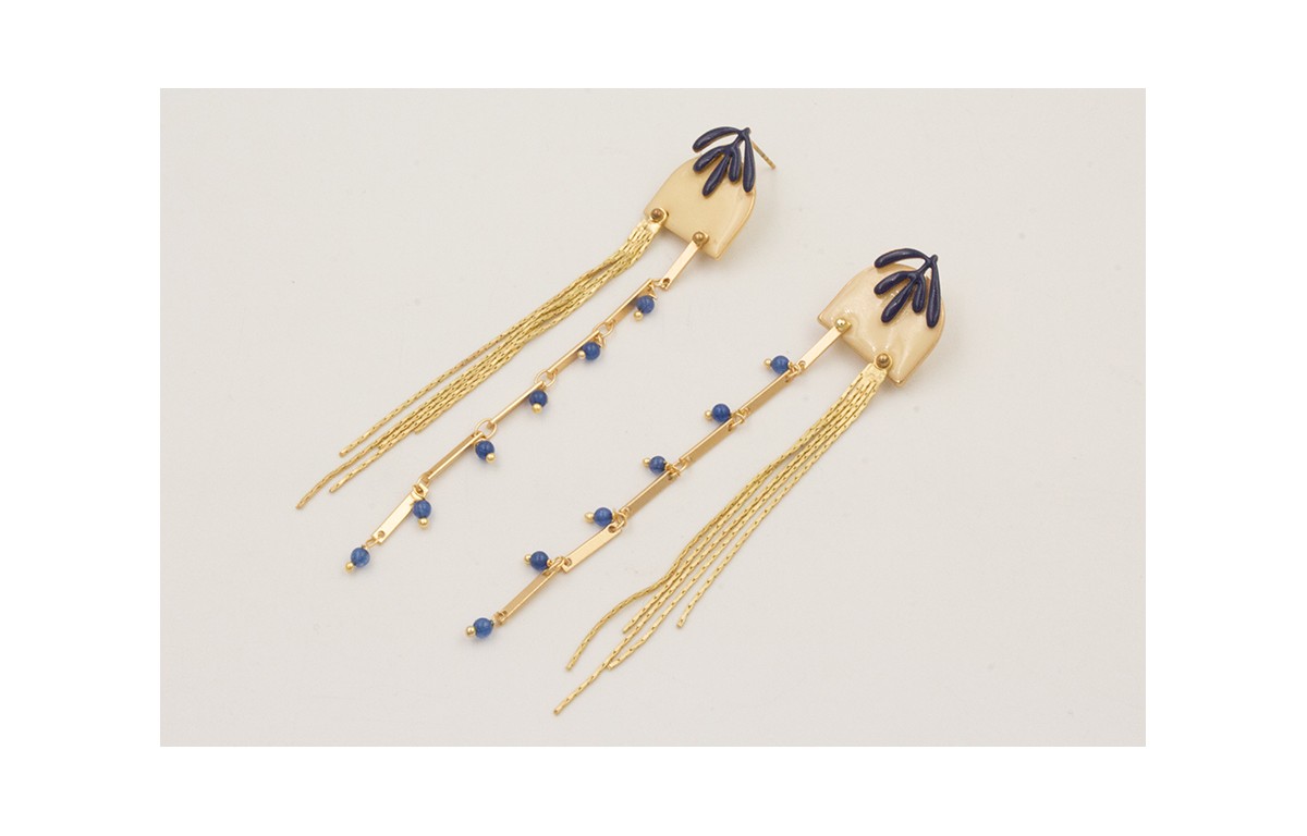 Pendientes hoja esmaltada azul oscuro con fleco dorado y cadena con bolas azul marino