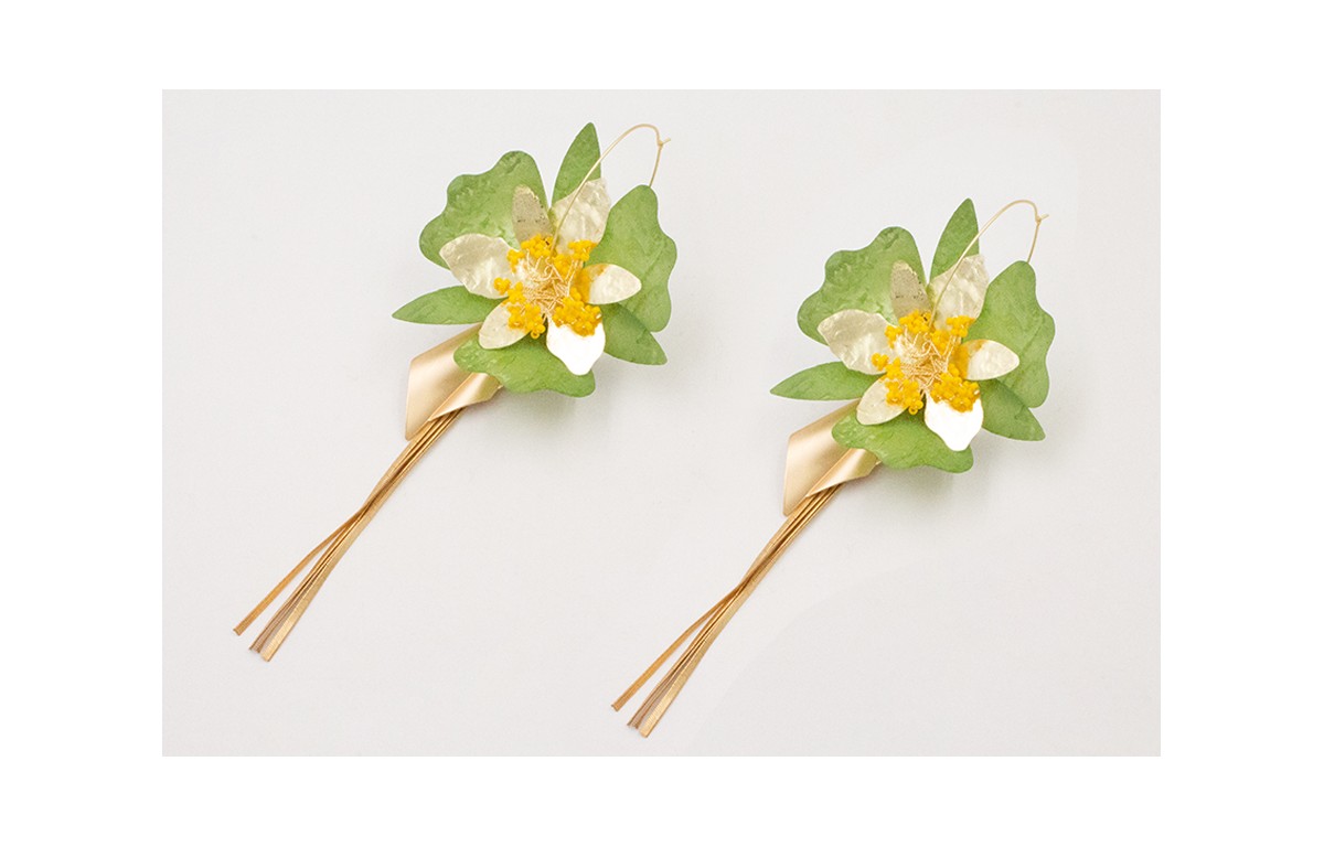 Pendientes aro grande dorado mate con lentejuelas flor grande verde y flor dorada con ramas de abalorios amarillos, colgante ondulado y fleco 4 tiras.