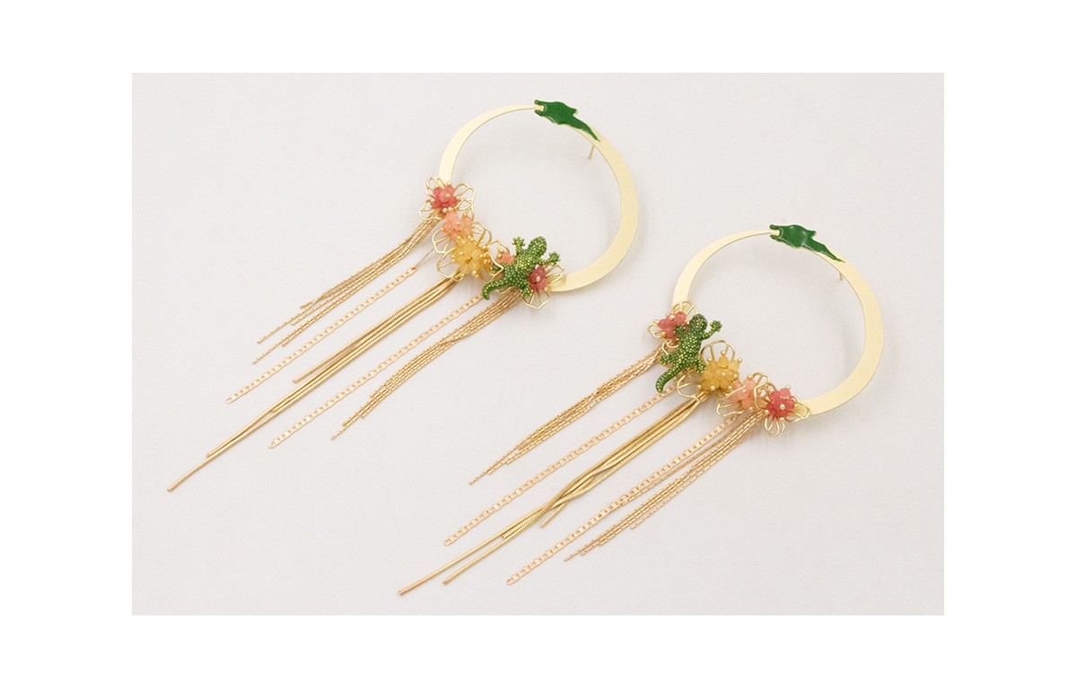 Pendientes aro dragón esmaltado verde con flecos cadenas,flores alambre dorado mate, burruños semipreciosas y lagarto pequeño esmaltado verde.