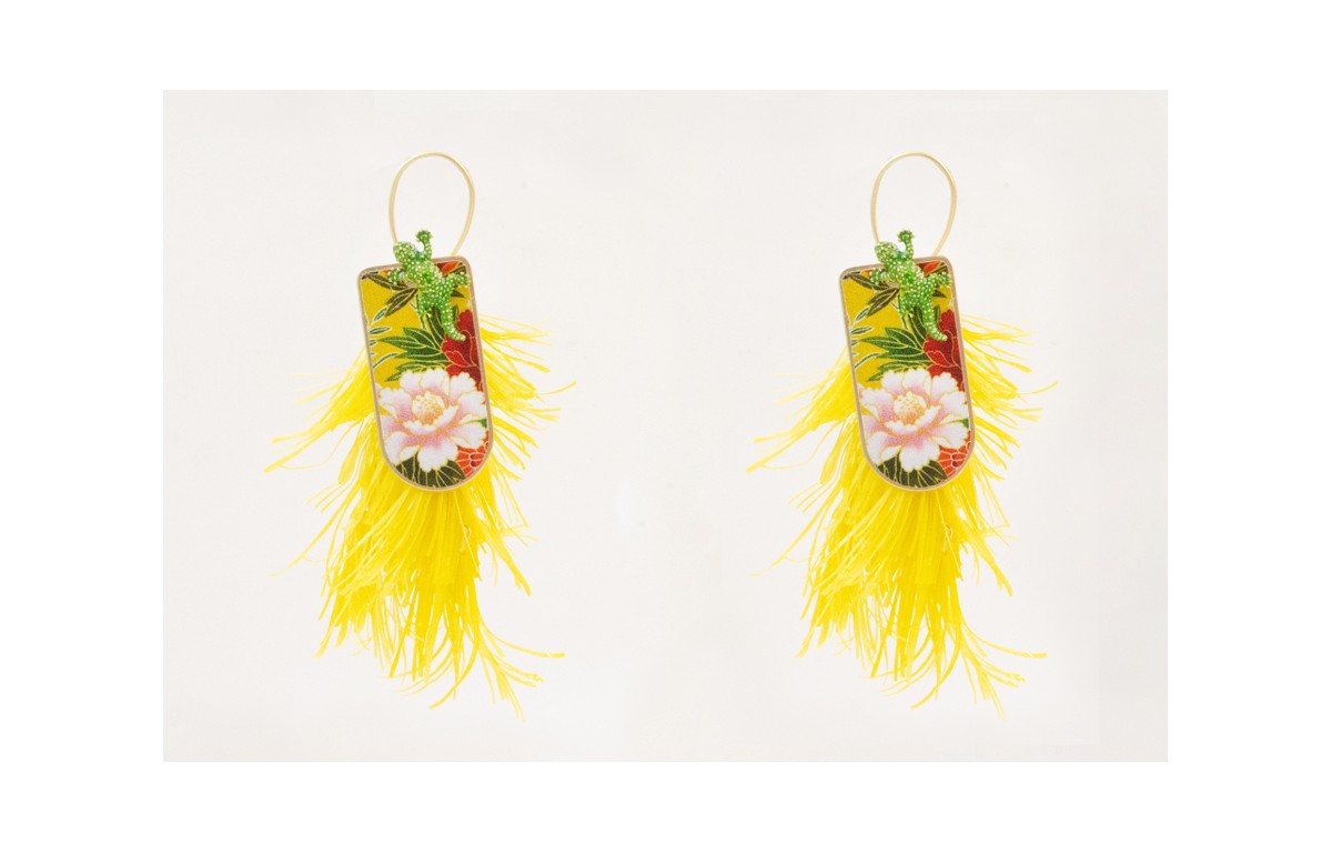 Pendientes perno herradura dorado mate con flecos de lentejuelas amarillas, pieza con flores amarillas,rojas y lagarto esmaltado verde.