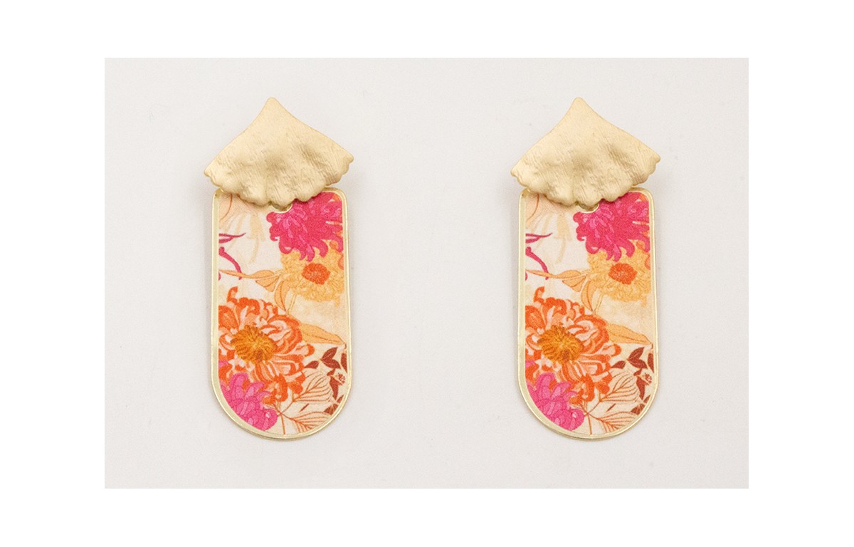Pendientes perno hoja triangular dorada mate con pieza flores rosas y blancas,