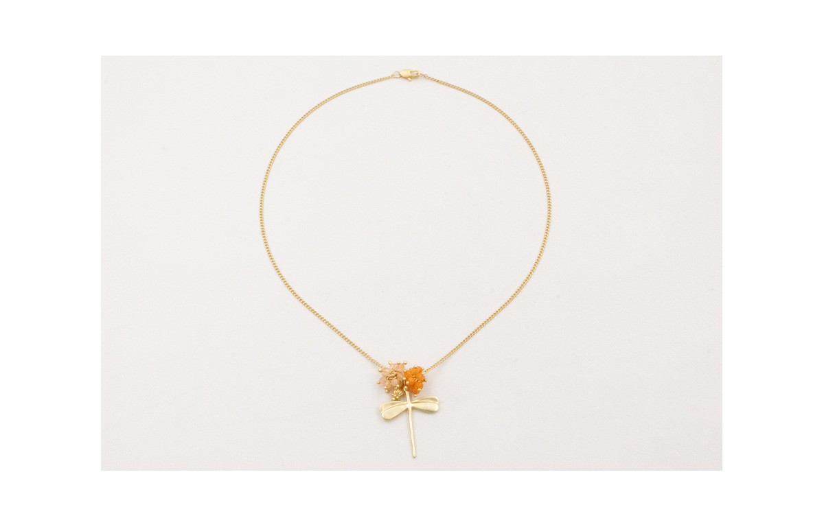 Collar cadena eslabón plano dorado mate con burruño bolitas rositas y naranjas colgantes libélula y campanilla doradas mates.