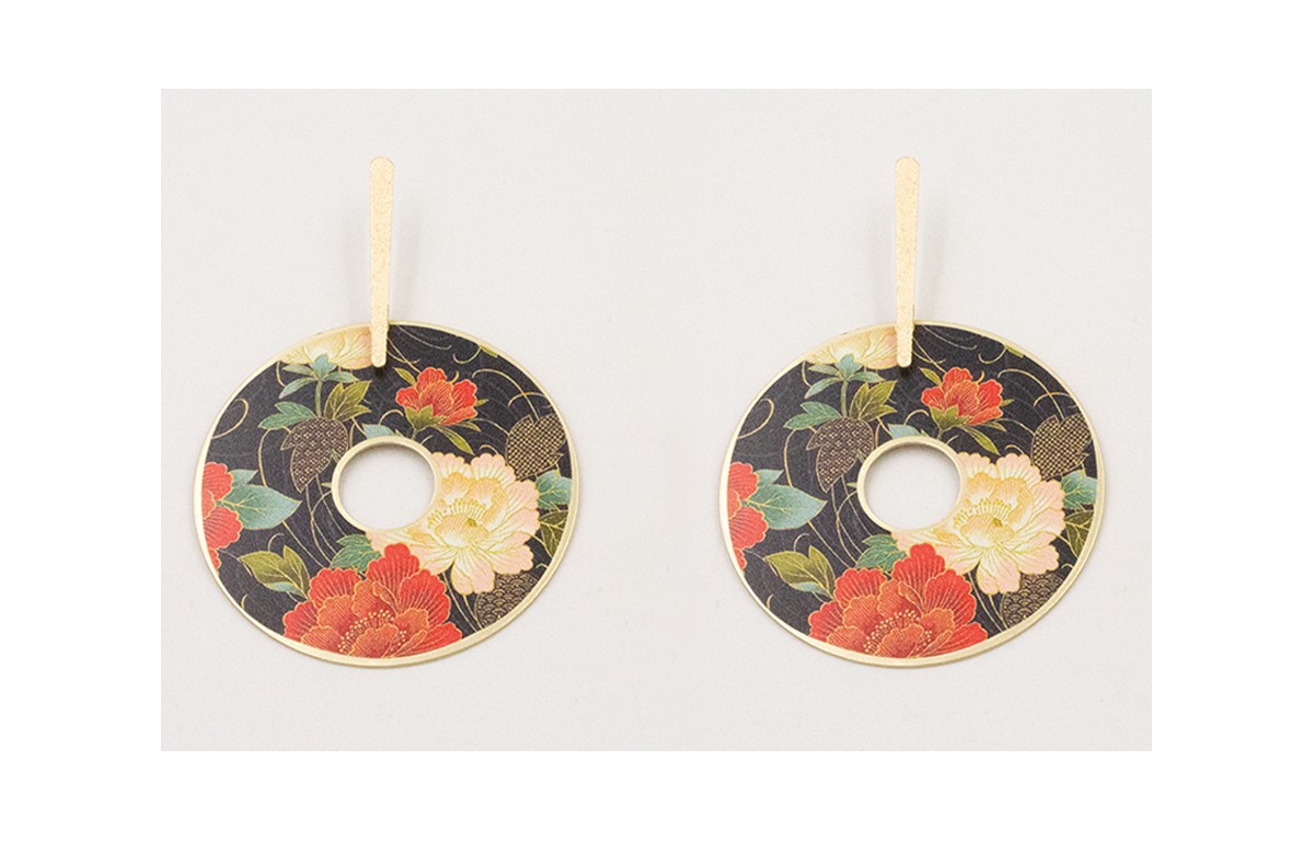 Pendientes perno lámina satinada dorado mate con colgante disco flores rosas,blancas y negras.