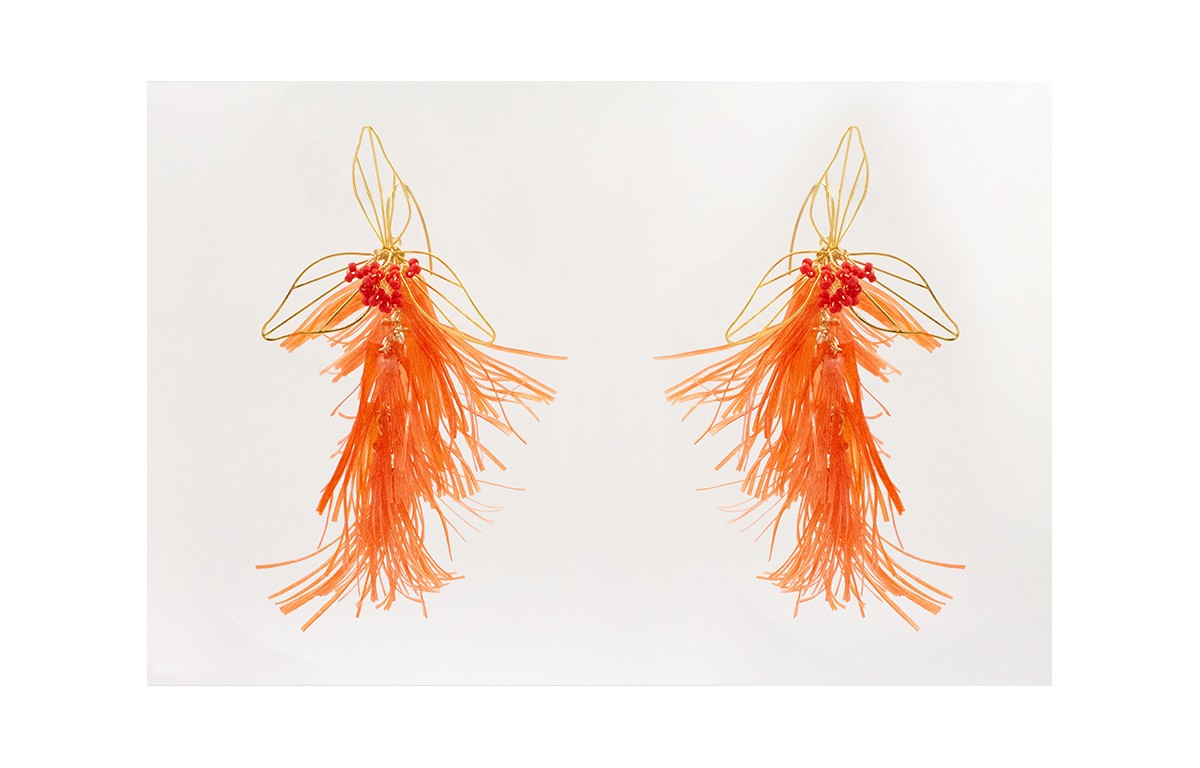 Pendientes perno gancho dorado con flecos lentejuelas naranjas, flor 3 pétalos dorado con ramas 6 pétalos rojos.