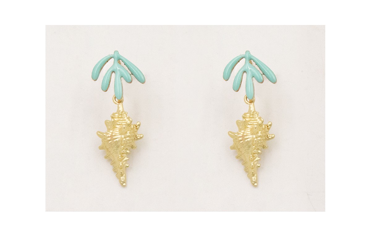 Pendientes perno hojas esmaltadas color turquesa con colgante caracola dorada mate.