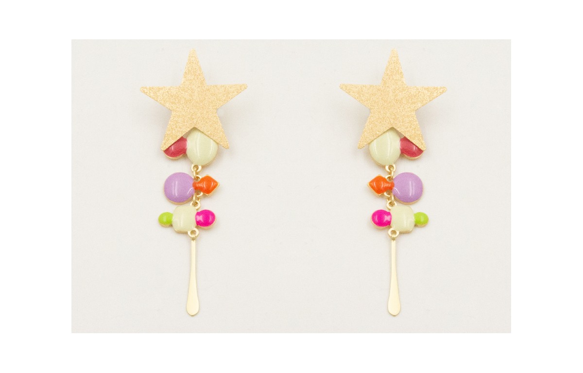 Pendientes perno estrella satinada con esmaltitos y gota plana dorada mate.
