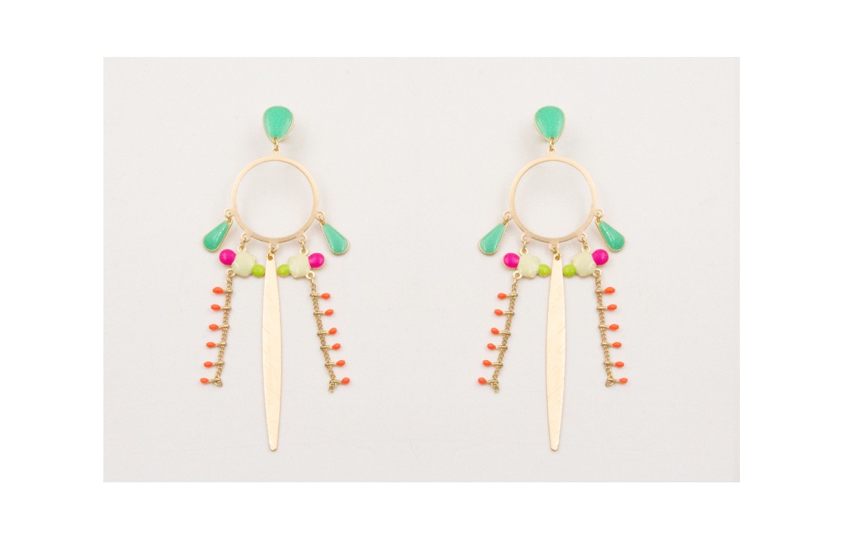 Pendientes perno gota esmaltada turquesa con aro 6 argollas con esmaltitos, lámina ovalada satinada con cadena de cerillas flour y gotas esmaltadas turquesa.