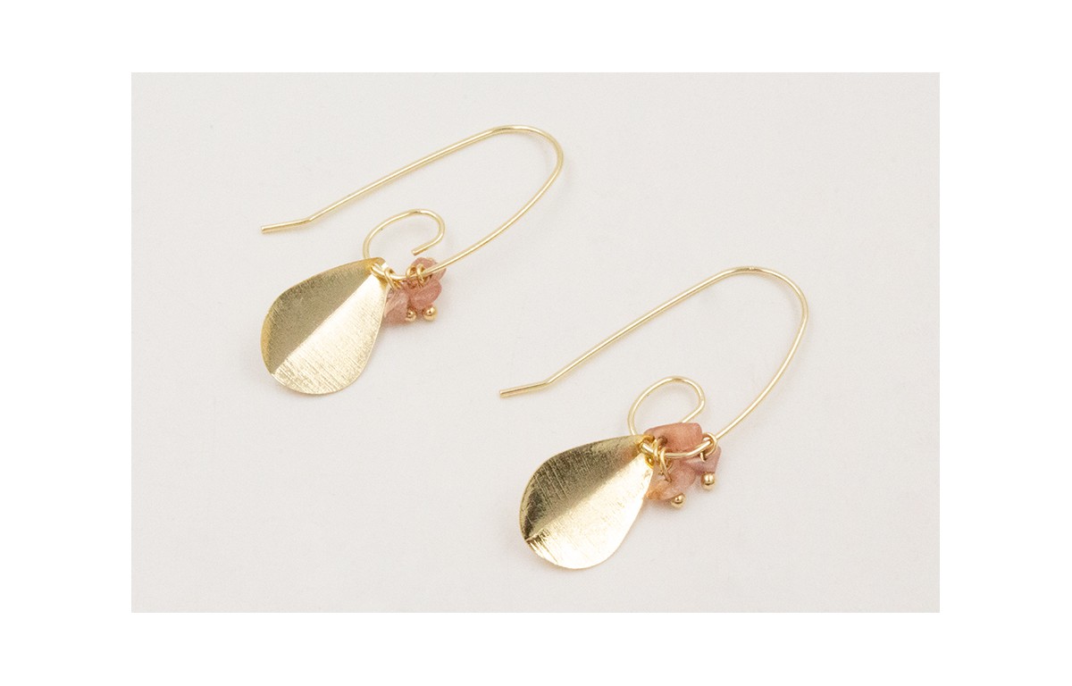 Pendientes gancgo largo dorado con chip turmaline rosa y péndulo doblado dorado satinado.