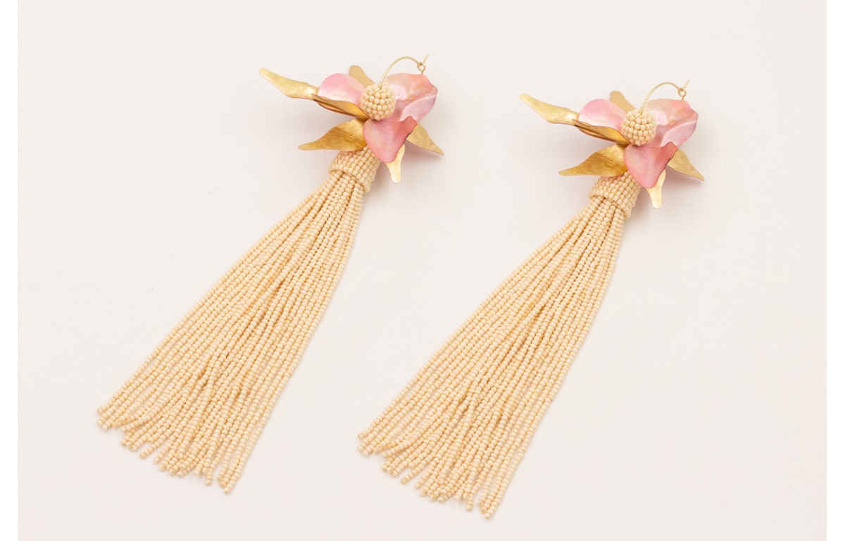 Pendientes aro mediano dorado mate con fleco y bola de abalorio crema con flores de lentejuela rosa y dorada.