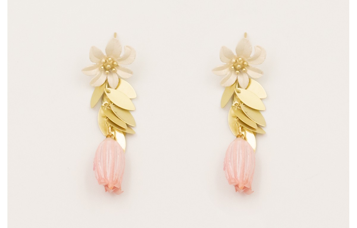 Pendientes perno flor esmalte natural crema,, colgante cadena ramilletes ovalado y flor natural campanilla rosa.