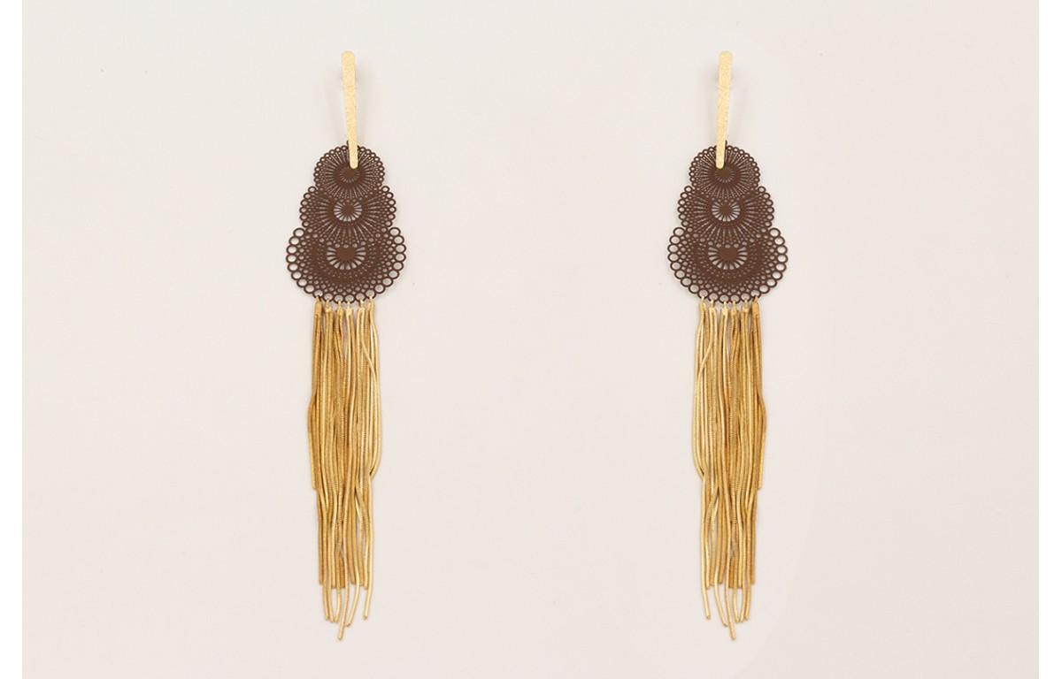 Pendientes perno lámina satinada con filigrana esmaltada marrón y flecos cadena cordón dorado mate colgando.
