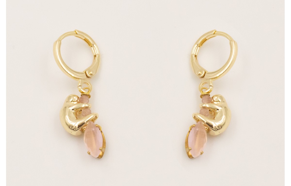 Pendientes cierre seguridad dorado con colgante koala doraro, facetadas lilas y cabujón cristal rosa opal.