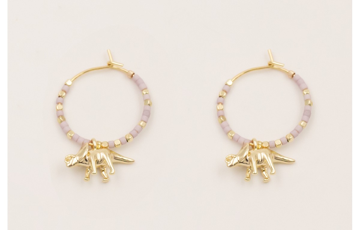 Pendiente aro dorado con miyukis lilas, mini facetadas doradas y dinosaurio dorado.