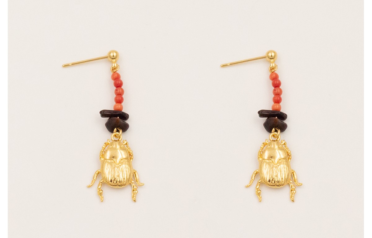 Pendientes perno bolita con chips coral marrones y micro tubos de coral y colgante escarabajo todo baño ORO18K-3micras.