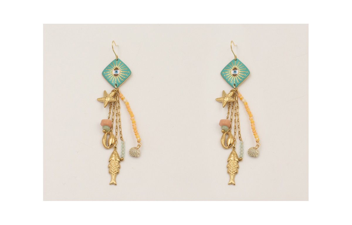 Pendientes acero inoxidable gancho con rombo ojo turco esmaltado turquesa colgantes pez, estrella de mar, concha, baston facetadas rositas y varias cadenas.
