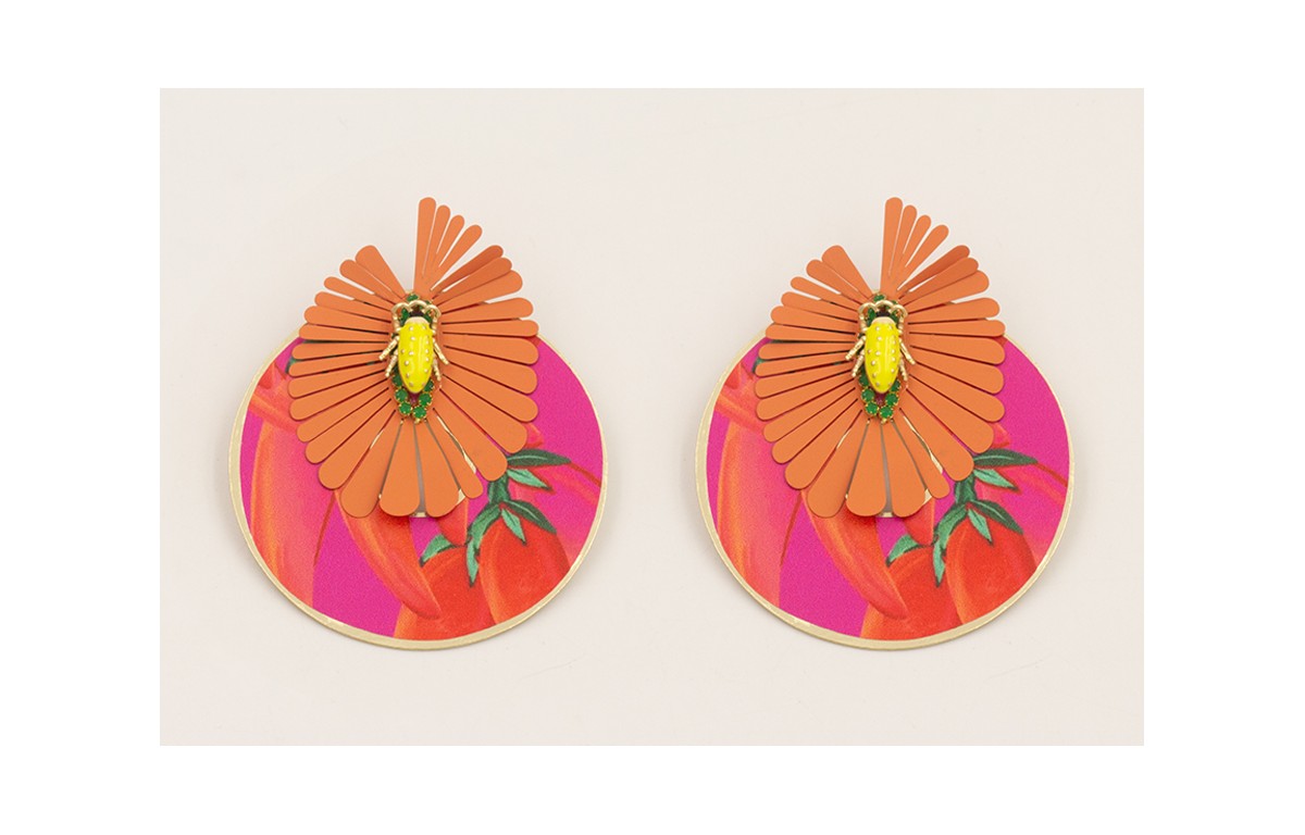 Pendientes flor pétalos coral colgante disco pimientos sobre fucsia y escarabajo lima.
