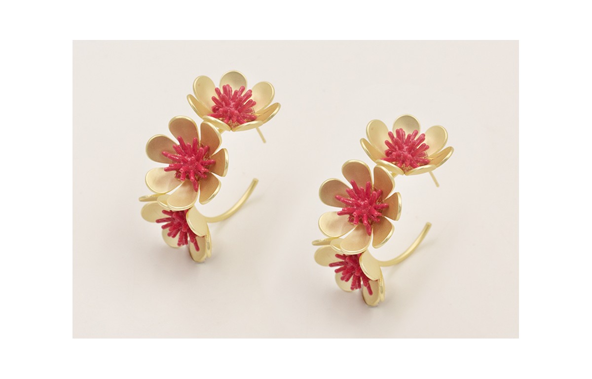 Pendientes aro 3 flores con estrellas coral esmaltadas rojo.