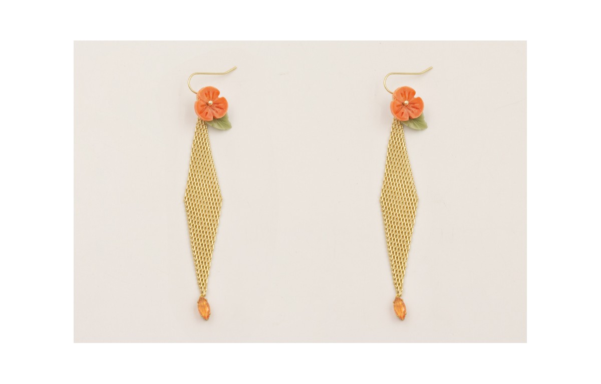 Pendientes gancho sencillo con malla en forma de rombo, flores de resina coral y cabijón de cristal color melocotón.