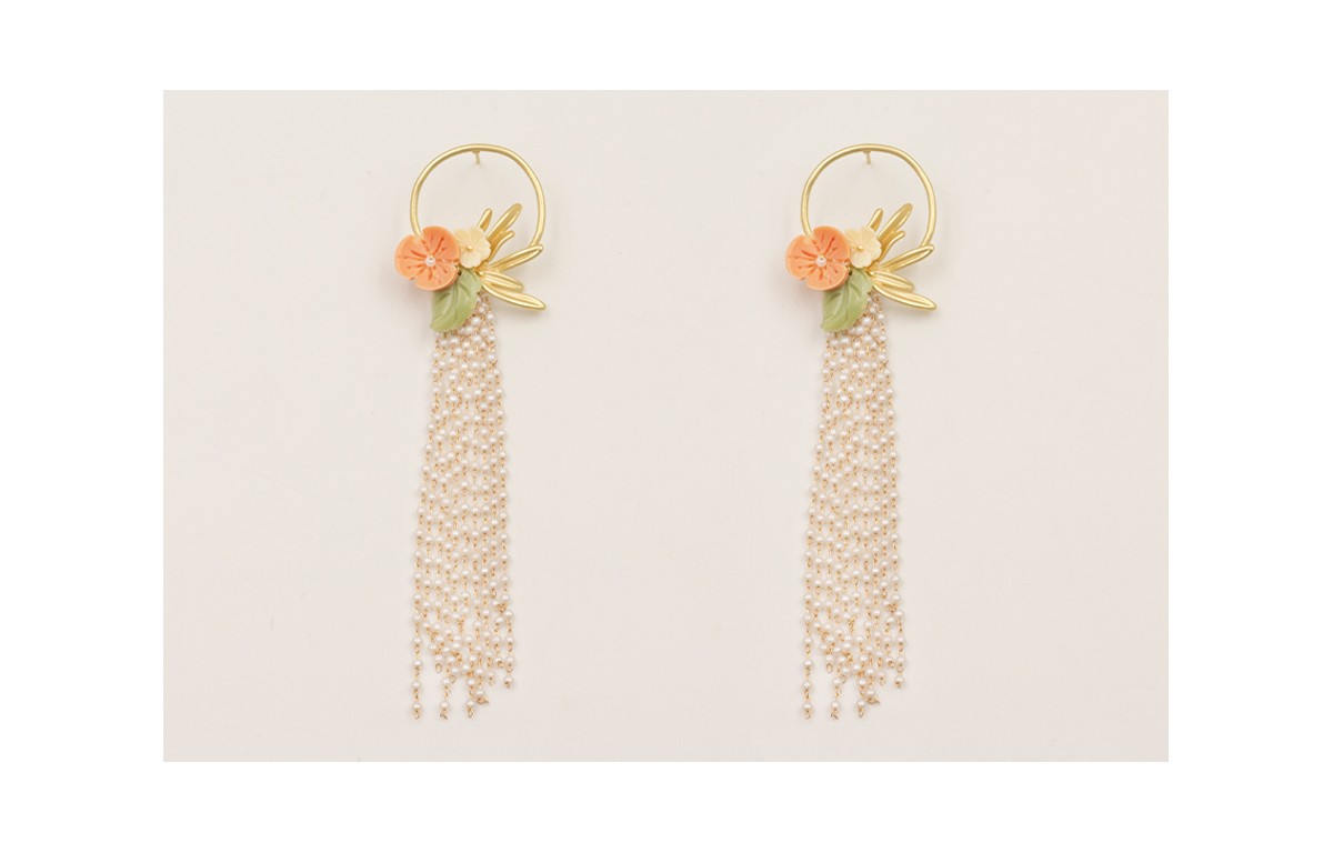Pendientes aro rama dorada mate con fleco de cadena de perlas, flores resinas de coral.