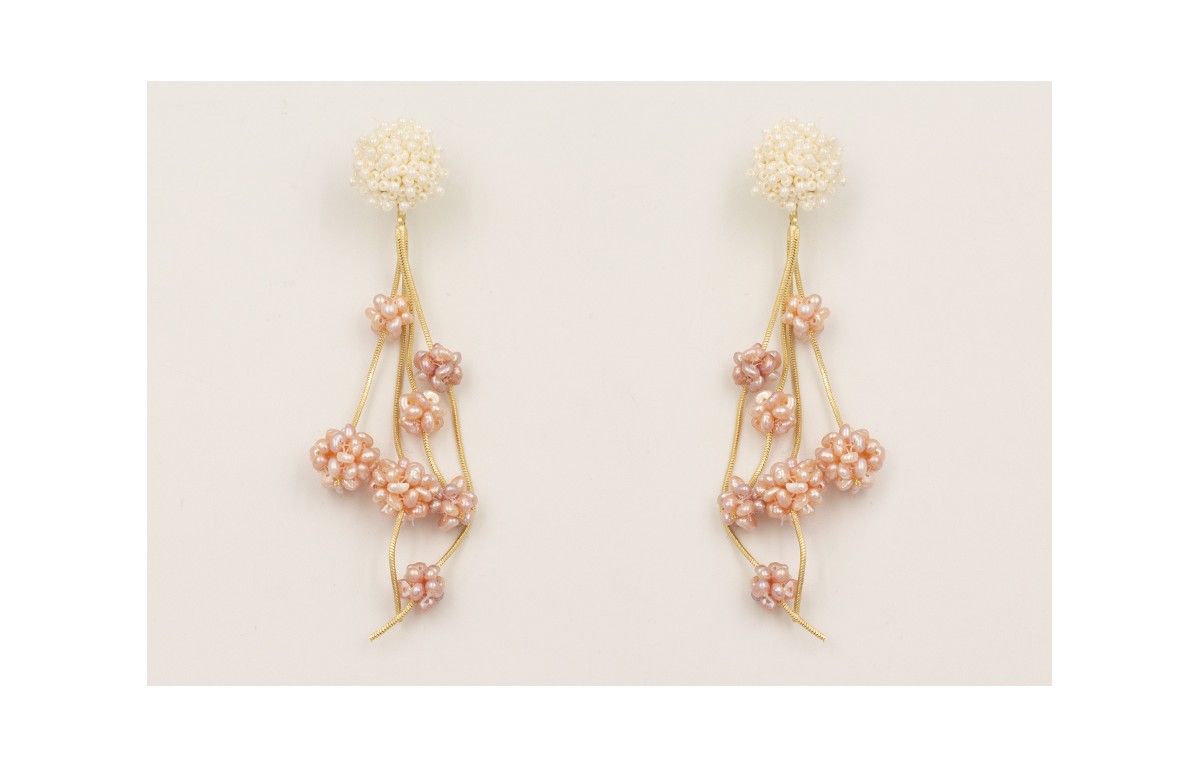 Pendientes fleco cadena dorado mate con bolas de perlas naturales tostadas y perno disco abalorio engarzado perlas.