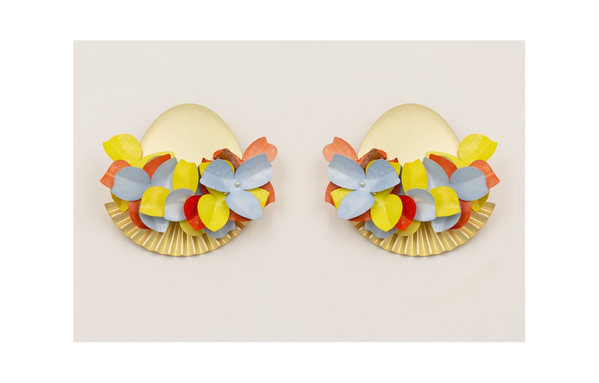 Pendientes perno gota 10 agujeros con flores de lentejuelas amarillas, naranjas, azules y abanico dorado mate.