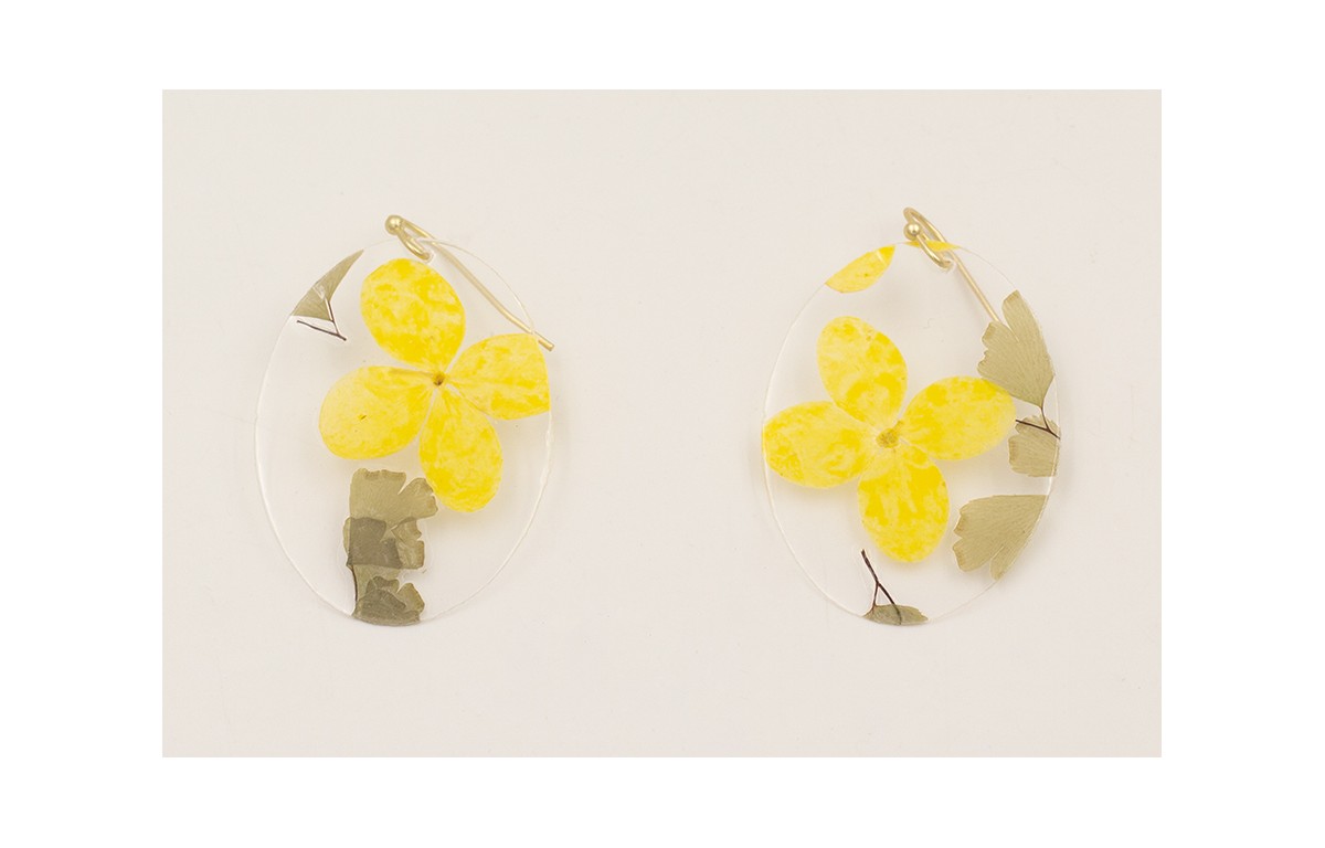 Pendinetes lentejuela ovalo dlores naturales amarillas con gancho dorado mate.