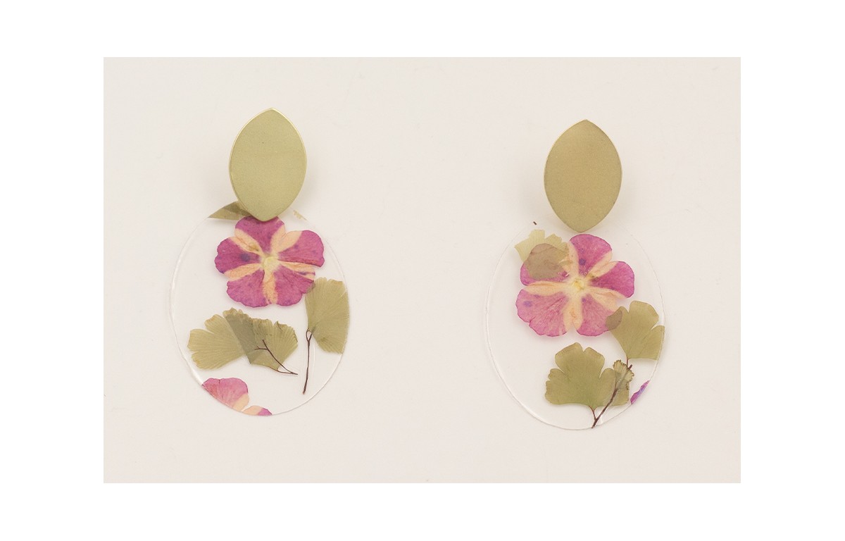 Pendientes perno ovalado dorado mate y lentejuela ovalada con flores naturales moradas.