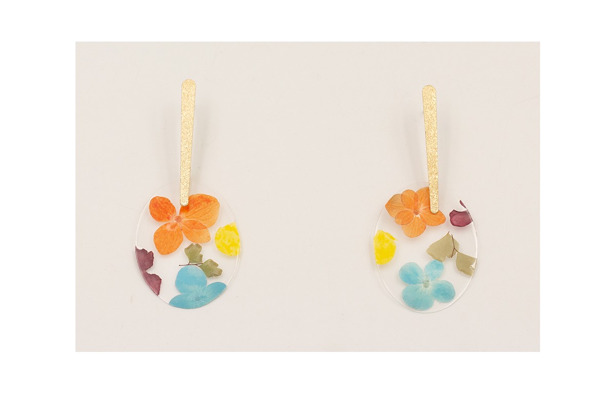 Pendientes lámina satinada y lentejuela ovalada con flores naturales naranjas, azules, moradas, amarillas.