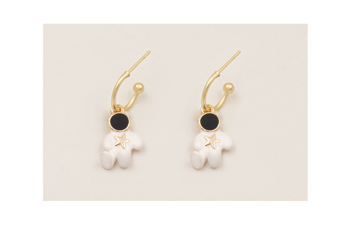 Pendientes semicirculo dorado mate con astronauta estrella en el pecho esmaltado blanco y negro.