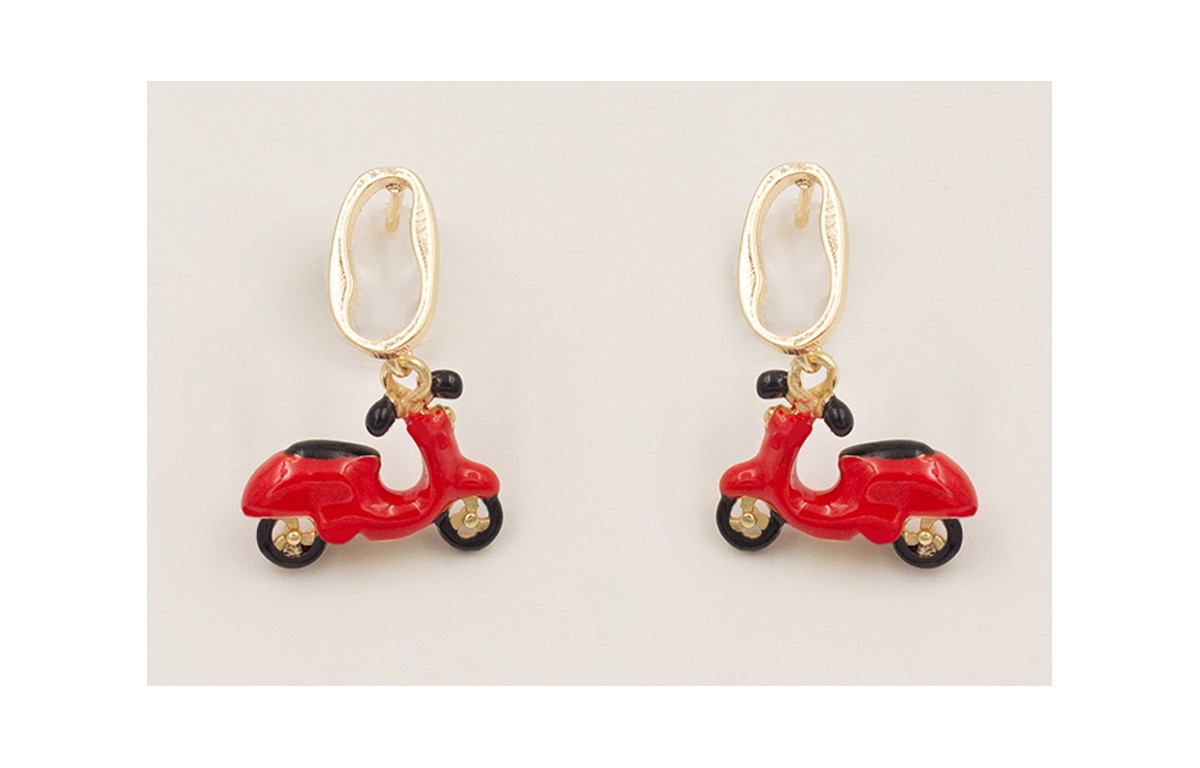 Pendientes perno ovalado hueco dorado con colgante vespa esmaltada roja.