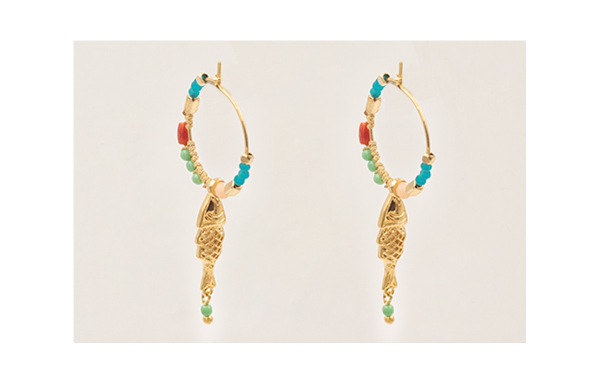 Pendientes ORO18K pez colgando con semipreciosas azules, verdes, coral, melocotón, rectangulos, microcubos.