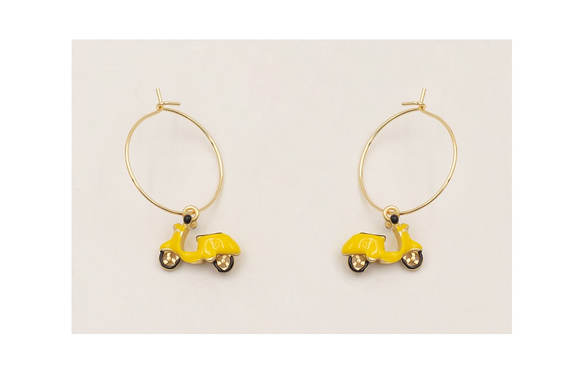 Pendientes aro dorado con colgante vespa esmaltada amarilla.