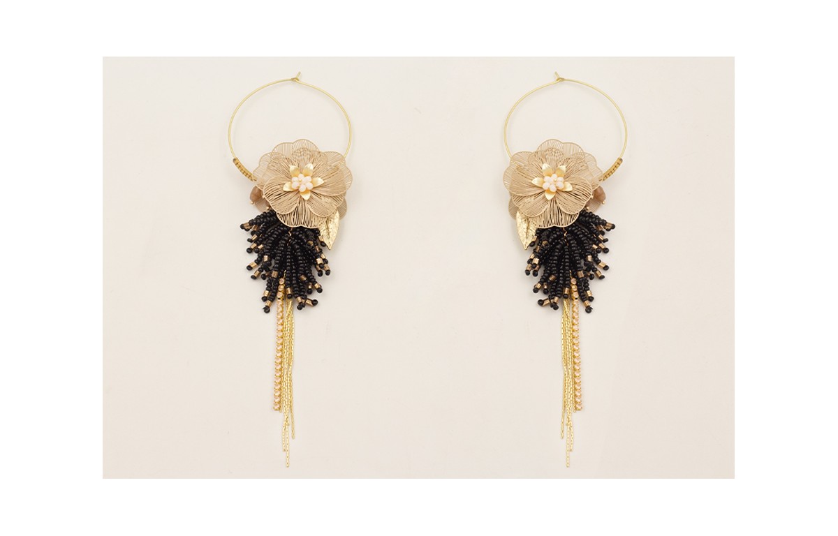 Pendientes aro con flora alambre esmalte beige, flos ovnis facetados beige, fleco abalorio negro, cadena de strass rosita, fleco dorado mate.