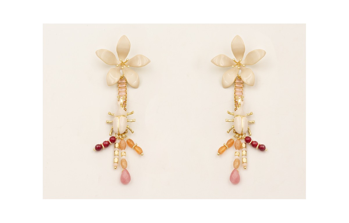 Pendientes flor esmaltada beige, cadena strass rectangular rosa, colgando semipreciosas tostadas, granates, ovnis beige, escarabajo esmaltado beige, gota rosa.