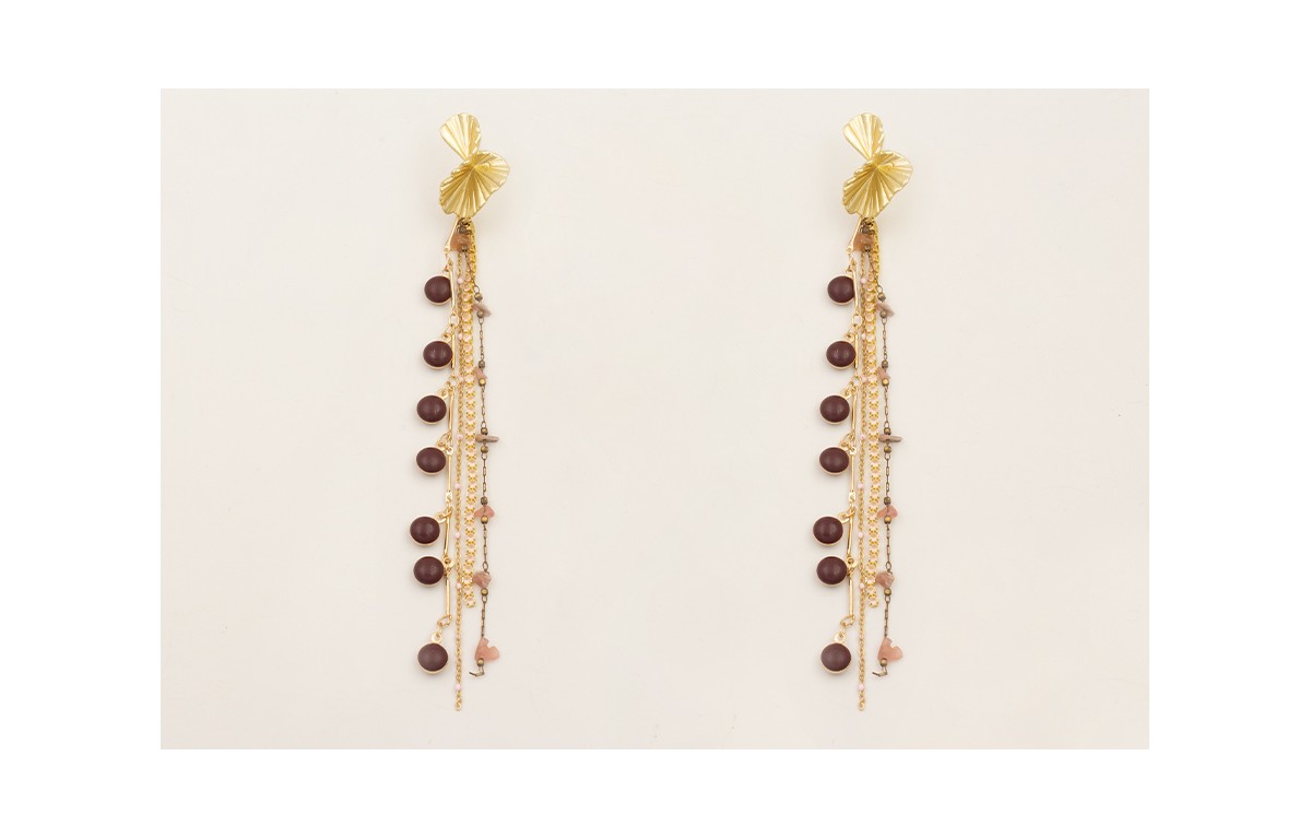Pendientes perno retorcido dorado mate con flecos de verias cadenas, micro esmaltes rosas, discos granate, turmaline rosa, strass rosa.